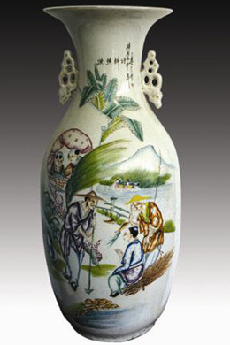圖4:為民國壬午年1942年北方窯口生產(chǎn)的粉彩“漁樵耕讀”大花瓶,此瓶高56厘米,底徑16厘米。胎體較前三樣粗糙,底釉釉色慘白,但粉彩畫面鮮艷光亮。圖中背襯蕉林遠(yuǎn)山、蘆蕩鴛鴦、流水圍欄,白發(fā)漁翁右手執(zhí)穿魚柳條,左手拄著釣竿,樵夫坐在柴禾上歇息,犁田歸來的農(nóng)夫以鋤為杖,拄著地與樵夫漁翁閑談,兩名讀書童子懷抱書本,趴在窗口,似懂非懂地聆聽三人的話語……