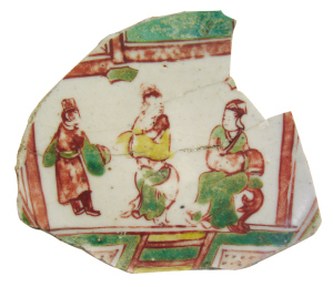 瓷器上的紋飾是那個(gè)時(shí)代的宣傳載體。手頭上有兩塊紅綠彩殘片,都是明代弘治、正德年前后的。這兩片都透露了那時(shí)的信仰和崇尚。圖1是紅綠彩孔明碗的碗心,圖2也是塊紅綠彩碗心,碗底有一個(gè)梵文字(圖3),分別傳遞出儒家思想和佛家思想。圖1畫著三個(gè)身著儒服的人,畫意應(yīng)該是“三人行必有我?guī)?rdquo;。圖中的這三個(gè)人好像是孔子、子貢和顏回。子貢對孔子說,我只能“聞一而知二”,顏回卻可以“聞一而知十”。孔子說:“弗如也。吾與汝弗如也。”
