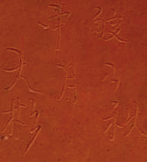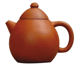 此壺為香港宜興老紫砂協(xié)會藏品,形制為傳統(tǒng)的龍蛋形,通高10.5厘米,寬12.5厘米,底銘“皎皎秋中月,大彬”。最早記載龍蛋壺的為清康熙、吳鼎梅《陽羨茗壺賦》:“圓者如丸,體稍縱,為龍蛋。”其胎質(zhì)為老朱砂泥,整器純以“打身筒”成形,砂質(zhì)粗礦,制作原始,器表砂孔粗,密度大,但透氣性好,外表修飾略為講究,但壺里粗糙可見,泥片曾用木板拍打促使泥胎緊密結(jié)合,并清晰看到身筒手工接片于流口處,指紋摁壓印極為明顯,壺內(nèi)壁觸摸薄厚不勻,典型的早期制壺風(fēng)格,是研究早期老壺成型工藝的很好教材。