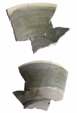唐青釉白口碗標(biāo)本(圖1)。此標(biāo)本胎體灰黑,玉璧形足,碗內(nèi)有三處支釘支燒痕,口沿施較厚的白色化妝土,余部未施化妝土,最后再整體加施青釉,燒成后形成青釉白口器。從標(biāo)本的玉璧足、橢圓支釘痕、器型來看這是一件唐代的產(chǎn)品。此類青釉白口器在唐代較為少見,從宋代開始多見白口器。此標(biāo)本的胎土、支燒痕具有耀州窯一些唐代產(chǎn)品的特征,這種青釉白口器的白口顯然是人為故意造成這種特殊效果,青釉形成則可能與耀州窯含鐵豐富的胎土有關(guān),或許施的是透明釉,但由于不能很好地控制胎土中鐵的成分而形成了青釉,也可能是工匠故意為之而形成的效果。