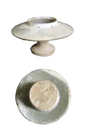 唐青釉加白高足燈標(biāo)本(圖2)。此燈胎土灰黑,折腹,高足,實心餅足,底足平而旋削痕跡明顯。燈沿向外平伸而出,燈內(nèi)壁有唇口向上突出,燈心平而下凹。在平伸的燈沿上面加施白粉,燈沿下面及高足并未施化妝土,燈整體施青釉至腹部,腹部以下無釉,燈的內(nèi)底無釉,無釉部分燒成后呈較淺的紅色。從灰黑胎土、造型、旋削痕跡來看顯然與耀州窯特征相近,應(yīng)該是唐代耀州窯的產(chǎn)品,尤其此類燈稍多一點。此燈與5號標(biāo)本工藝明顯相似,是同時代同窯口的器物。