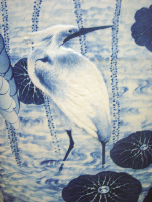 瓶頸和腹體裝飾都是分三個主要層次:上層是復(fù)式如意云首,每一云首內(nèi)繪一朵蓮花,為明洪武、清康熙云首風(fēng)格,瓶頸、腹體如一;中層為主畫面,瓶頸簡約地繪畫一周連枝葡萄,瓶腹體繪荷塘景物通景一周,為整個瓶體裝飾的主畫面;下層為復(fù)式變形蕉葉紋飾,每一蕉葉尖飾一云頭,云頭內(nèi)繪一朵蓮花。腹體主畫面所繪蓮荷的蓬、花、苞、葉含放舒卷自如,蓮荷之間繪有四只款款飛舞的蜻蜓,三只立于荷梗之上的精靈黃鶯,三只偃仰反側(cè)的鷺鷥,三只姿態(tài)各異(蹲、跳、浮游)的青蛙。整個荷塘極具縱深感、立體感,景物工寫兼?zhèn)洌瑸t灑飄逸,栩栩如生,一派生機(jī)勃勃的景象。瓶頸的上、下口沿另外繪有云氣紋和回紋一周,使瓶頸愈發(fā)顯得富麗堂皇;腹體脛下另有一組波紋曲線和一圈連枝紋環(huán)繞。整個瓶體畫面莊嚴(yán)大方,氣象清新。