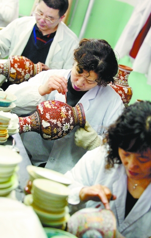 打磨先用金剛砂石水磨,目的在使成品的表面平整。所謂平整,一是銅絲跟涂上的色料一樣高低,二是色料本身也不許有一點(diǎn)兒高高洼洼。磨過以后又燒一回,再用磨刀石水磨。最后用椴木炭水磨,目的在使成品的表面光潤。椴木木質(zhì)勻凈,用它的炭來水磨,成品的表面不起絲毫紋路,越磨越顯得鮮明光滑。