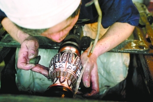 掐絲就是拿扁銅絲粘在銅胎表面上。這是一種非常精細(xì)的工作。掐絲工人心里有譜,不用在銅胎上打稿,就能自由自在地粘成圖畫。