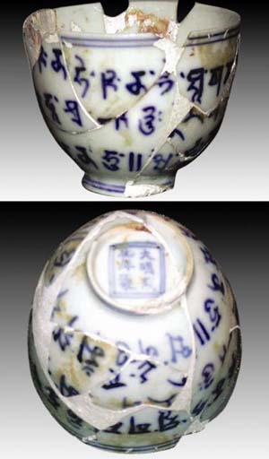 我們可以發(fā)現(xiàn),各個(gè)時(shí)期的統(tǒng)治階級(jí)都通過(guò)這樣的安撫政策,既維護(hù)了國(guó)家的統(tǒng)一,也保證了外疆的安定團(tuán)結(jié)。這件明代成化官窯梵文青花杯,正是當(dāng)時(shí)景德鎮(zhèn)珠山御窯場(chǎng)為了滿足御賜藏族僧侶而專門燒造的瓷器之一。雖然已經(jīng)殘破,但足見(jiàn)當(dāng)時(shí)燒造工藝精湛,器物雖小,可它記載了一段歷史,讓今人不忘西藏地區(qū)在明代依然是中國(guó)不可分割的神圣領(lǐng)土。