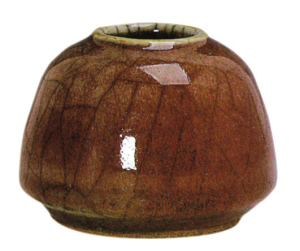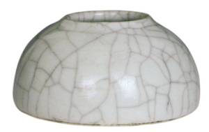 哥窯開片馬蹄形水盂(圖1),高4.5厘米,口徑2.9厘米,長直口、溜肩,圓腹,平底露胎,周身碎開片,釉色瑩潤,造型優(yōu)雅。
