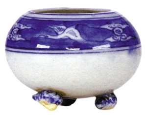 青花云雁紋水盂(圖3),高5.3厘米,口徑4.8厘米,平口,溜肩,圓腹,青花螺螄三足托起盂體,口沿、腹中分別飾有兩道和一道青花線,腹繪青花云雁紋,下部留白;整體構(gòu)思奇巧,造型雅致,獨(dú)特古樸,釉色光亮,青花發(fā)色沉靜素雅,可謂天水一色,堪稱水盂精品。
