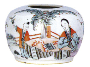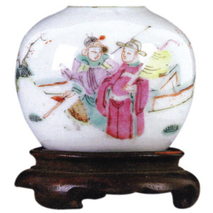 粉彩人物水盂(圖4),高6厘米,口徑2.8厘米,短直口,溜肩,圓腹,平底,腹繪粉彩人物塑制精美,人物頭戴冠帽,姿態(tài)逼真,頗富恬淡、優(yōu)美、生動的情趣,極具神韻。
