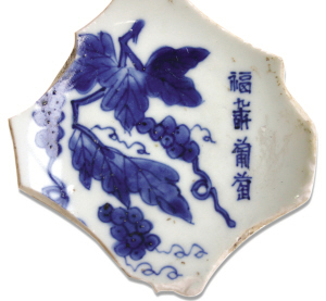 葡萄。明清之際,以葡萄為題材入青黃花瓷畫者甚多。作為瑞果,主要取其累累果實(shí),“多子多福”之意。