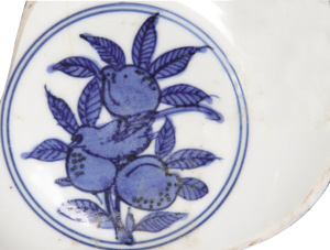 石榴。石榴花是繁榮昌盛、和睦團(tuán)結(jié)的喜慶佳兆;果為多子多孫、多福多壽的祥瑞象征,在明中、晚期青花瓷上為多見。畫面上一株石榴,漿果破皮而出,寓意“榴開百子”。榴、桃、佛手同繪,為多子、多壽、多福。