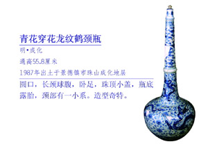1987年于江西省景德鎮(zhèn)珠山明御廠故址出土:圓口,長頸,球形腹,臥足。珠頂鐘形蓋,內有一較長的管狀物,與頸緊密接合。頸部有一小系。腹繪穿花龍二條,下繪侮水。長頸中央有一凸起弦紋分上下兩節(jié):上節(jié)繪云紋,下節(jié)飾龍紋。此瓶繪五爪龍,當屬帝王用器。