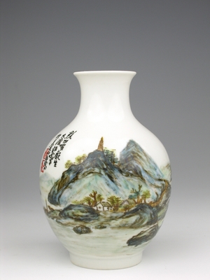 汪大滄對藝術(shù)的追求是認(rèn)真嚴(yán)格的,畫任何一件作品,所要表現(xiàn)的題材對象,他都要到生活中去感受和寫生。他善于畫淺絳彩和粉彩,更擅長以禿筆繪畫粉彩山水、技法嫻熟、用筆簡練、豪放渾厚,專以細(xì)筆精描取勝,其筆墨獨(dú)樹一幟,為禿筆山水堪稱一絕,在40年代,享有盛名。如彩繪《雁陣秋摧圖》瓷板畫,是以墨彩勾皴江岸山水坡坨之景,皴法迅疾勁削,青綠彩料敷染,有山石硬質(zhì)之感。江中泊舟行船,草尾臨水架設(shè)、遠(yuǎn)空一列秋雁盤旋漸去。此畫用筆粗獷,給山水之景蒼芒渾厚,有一派蕭索秋意,正與主題相合。他的畫筆墨草草,勾、皴之法同時(shí)并用、觀之仿佛逸興之筆,透出文人山水畫疏朗簡淡的風(fēng)格。汪大滄一生淡泊名利,善待對人,不依附庸權(quán)貴的高尚品格,著實(shí)為后人傳頌。解放后,他先后在第一畫瓷合作社和建國瓷廠畫瓷,為黨為人民創(chuàng)作了許多優(yōu)秀作品。