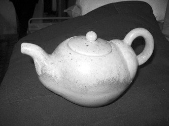 眼前,一把油亮亮、光閃閃,色澤、造型都特別奇怪的茶壺(左圖),黃褐色調(diào)中夾雜著少許奶油基色的茶壺,仔細(xì)品鑒這把茶壺的材質(zhì)不是紫砂,不是瓷器,更不是用石頭雕刻的。在場(chǎng)的幾位藝術(shù)界朋友欣賞過(guò)后認(rèn)為此壺的設(shè)計(jì)思路大有新思路。“這是我最近新創(chuàng)作的‘紅頂商人’日本古陶茶壺。這與傳統(tǒng)的紫砂壺有什么不一樣?”上海著名抽象派油畫(huà)家彭鳴亮說(shuō)道。