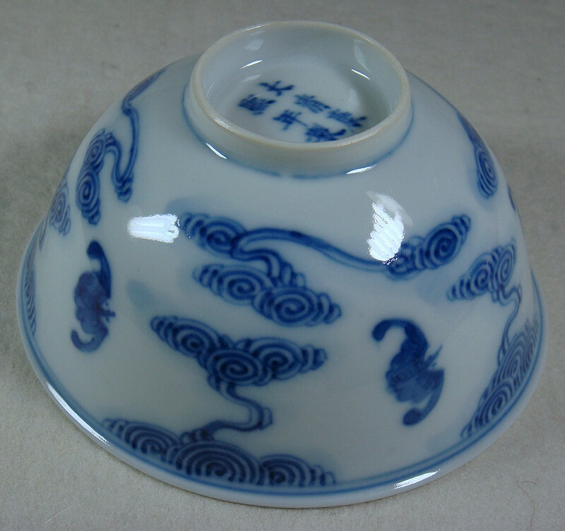 雍正(1723—1735)、乾。1736—1795)時(shí)期青花器多仿明永樂、宣德的蘇麻離青,但沒有進(jìn)口料,以筆端點(diǎn)染鐵銹斑痕。 其次是仿成化的淡描青花。仿明器物除了從胎、釉、青料等方面區(qū)別外,器型也是重要的區(qū)別點(diǎn):明器的胎接口是上下接,清器是前后接。青花雍正時(shí)工藝精細(xì),修胎講究,民窯器則粗糙、有旋胎痕。乾隆時(shí)尤其是后期工藝開始走下坡路,除了繼承前朝的品種外,還有創(chuàng)新的品種青花玲瓏瓷。紋飾內(nèi)容也較雍正時(shí)多樣,但總的來說以寓意吉祥的圖案為主?钭R(shí)除年款外, 雍正時(shí)較多見的有雜寶款、四朵花款、動(dòng)物形款等,堂名款較康熙少。乾隆時(shí)堂名款又較雍正的多,年款多篆書,也有四朵花款。