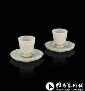 時(shí)至十八世紀(jì),好古慕雅之風(fēng)在清廷經(jīng)久不衰。康雍干三朝盛世,君主皆汲汲于搜求古董文玩,對(duì)于用當(dāng)代材質(zhì)制成的仿古器物,他們亦青睞有加。拍品中有一對(duì)讓人贊嘆不已的白玉杯配花菱形盞托 (拍品1021號(hào)),其鐘型杯身光素?zé)o紋,乍看之下,似乎與仿古器物毫無關(guān)聯(lián)。其實(shí),其托盤精致的菱式造型,可上溯至漢代漆器及年代略晚的金銀器。眾多精品中,尚有一件較為明顯的仿古之作,即珍罕之至的黃玉仿古觥 (拍品1017號(hào))。玉匠采用了上乘的黃色美玉,并師法青銅器形,將之琢成古意盎然的玉觥。工匠已盡量避免在器身浮雕紋飾,藉以突顯石材的天然色澤。觥身唯一的裝飾是其精美的仿古卷草形柄,下承小巧玲瓏的仿古鳳凰,其蓋頂?shù)木聿菁y裝飾襯以螭龍。白玉仿犀角饕餮紋杯 (拍品1018號(hào)) 亦屬仿古器物,其構(gòu)思之妙讓人嘆為觀止。此杯形制敦碩,雕琢細(xì)膩,器身下半部狀似枝葉繁茂的卷草,造型儼若盞托。杯身大體光素,僅在器腰淺雕饕餮紋一匝。總的來說,此杯糅合了仿古器物的兩大特征:其形制脫胎于古代角雕,而饕餮紋飾則是師法古青銅器。