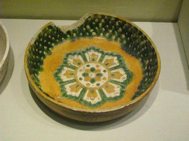 刑窯是唐代北方白瓷的主要產(chǎn)地,在內(nèi)邱縣。1984年始終對內(nèi)進(jìn)行調(diào)查,發(fā)現(xiàn)古窯址二十八處,分為西關(guān)和中豐洞兩大區(qū),在窯址采集到大量標(biāo)本,有白瓷、青瓷、黑瓷、邢窯、醬瓷,同時(shí)也發(fā)現(xiàn)了三彩。這些三彩標(biāo)本據(jù)分析是中晚期產(chǎn)品。發(fā)現(xiàn)的三彩胎質(zhì)細(xì)膩,呈白色或淡紅色,均素?zé)笫┯詮?fù)燒而成。三彩釉的燒成溫度低于素?zé)郎囟,?fù)燒過程中不會(huì)再變形,損壞較少,故出土的帶釉標(biāo)本少,素?zé)龤埰鞫唷S再|(zhì)瑩潤,流動(dòng)性很強(qiáng),釉層可見極細(xì)的開片,器物按釉色有淡黃單色釉、深咖啡單色釉和三彩釉。三彩施赭黃、深綠、褐紅、白等色,釉層凝厚,色調(diào)從淡到濃,融和絢麗,斑駁多彩。 出土的唐三彩瓷器有三足罐、雙耳罐、平底盤、弇口缽、杯等。另有人形燈和動(dòng)物塑像,都造型生動(dòng),不像民間用器,可能是貢品。三彩杯和揚(yáng)州唐代中期墓葬出土的造型完全一致,也可能屬外銷品。