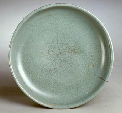 釉色:釉面較為光亮,一般都是細(xì)密開片,無紋片者較少見。釉下有稀疏氣泡,在光照下時(shí)隱時(shí)現(xiàn),似辰星閃爍,在胎與釉的結(jié)合處微現(xiàn)紅暈。器型有盤、碟、洗、出戟尊、玉壺春瓶、膽式瓶、三足洗、撇口碗、十瓣葵花口碗、葵瓣盞托、橢圓形水仙盆等。盤的圈足較大,圈足外卷呈“八”字狀。