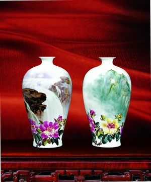 《源・脈》對(duì)瓶特選經(jīng)典梅瓶造型,器型端莊,胎質(zhì)潔白通透,色澤柔和鮮亮,融筆意、詩(shī)情、畫理于一體,準(zhǔn)確生動(dòng)的描繪,美不勝收,柔美中有雄渾之氣。觀黃河壺口瀑布飛流直下,覽八達(dá)嶺長(zhǎng)城雄偉壯觀,賞牡丹花枝繁葉茂,有景有意,氣韻悠長(zhǎng)。通過(guò)大紫、淺綠等色彩斑斕而有序的搭配運(yùn)用,達(dá)到了一種遠(yuǎn)看色、近看花的奇特效果。一束束流暢游動(dòng)的線條,一處處開(kāi)合有度、錯(cuò)落聚散的皴點(diǎn),一塊塊對(duì)比和諧的色彩,其純度、厚度、透明度猶如春天的陽(yáng)光清澈明凈。大膽的用色和用筆,給人一種艷麗脫俗之感,恰到好處地表現(xiàn)了牡丹花國(guó)色天香的高貴品格。整體畫面虛實(shí)相生、動(dòng)靜相襯的裝飾手法,具有強(qiáng)烈的視覺(jué)沖擊力。