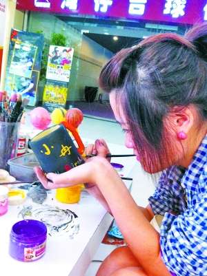 在農(nóng)業(yè)路寶龍廣場(chǎng)內(nèi)的一家陶吧里,琳瑯滿目的陶藝DIY手工藝品擺在櫥窗里,完全沒(méi)有從機(jī)械模出來(lái)的單調(diào),手劃的色條,也沒(méi)有了機(jī)印上去的乏味,好看、有趣得讓人愛(ài)不釋手。這些獨(dú)特好看的作品像一雙雙搖擺的手,無(wú)時(shí)無(wú)刻不在吸引著你的注意。再加上店內(nèi)的輕音樂(lè),一股雅致的氣息油然而生。