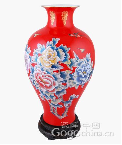 圖:富貴牡丹花開紅瓷侍女花瓶
