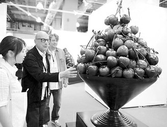 藝術(shù)家向觀眾介紹雕塑作品《紅櫻桃》