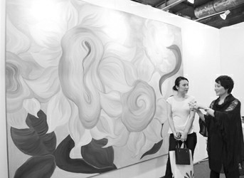 發(fā)現(xiàn)新銳,是許多收藏家和畫(huà)廊業(yè)者觀看藝博會(huì)的一大目的。吳訓(xùn)木是新近被滬上畫(huà)廊發(fā)現(xiàn)并首次在藝博會(huì)上推出的傳奇性畫(huà)家。他人生道路大起大落,最后放棄了財(cái)富羈絆,選擇了流浪和繪畫(huà)的自由?此某橄螽(huà),觀眾感嘆他怎么會(huì)有如此充沛的激情和體力。他在巨幅畫(huà)布上揮灑五彩,如狂風(fēng)暴雨。不少路過(guò)的行家異口同聲道:“中國(guó)的波洛克(美國(guó)抽象表現(xiàn)主義先驅(qū))!”