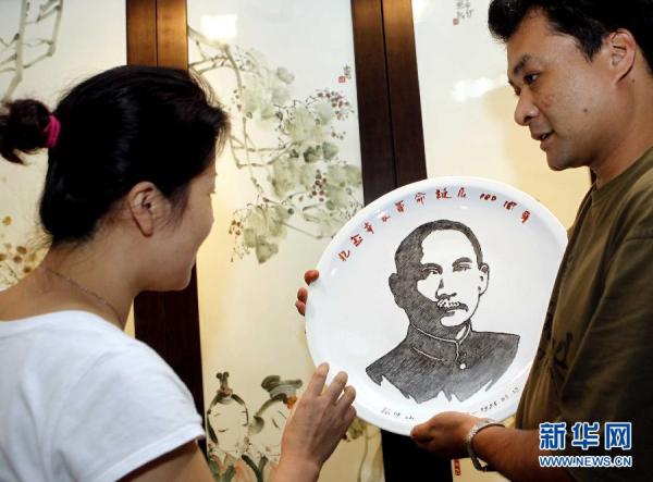9月13日,陶瓷藝術(shù)家李德惠(右)在向參觀者介紹高溫白釉瓷盤《孫中山肖像畫盤》。當(dāng)日,亞洲最大規(guī)模的藝術(shù)品交易盛會“2011上海藝博會”在上海世貿(mào)商城向?qū)I(yè)人士開放。來自12個國家的155家畫廊攜數(shù)千件油畫、中國畫、陶瓷、版畫、雕塑、水彩、攝影、裝置等藝術(shù)品參展。據(jù)悉,“2011上海藝博會”將于9月14日至18日在上海世貿(mào)商城舉辦。