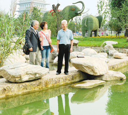 圖為面對(duì)世園美景,楊火。ㄓ乙唬⿲(duì)陪同游覽的西安朋友說:“看到這片水面,讓我想起了自己家鄉(xiāng)的鄱陽湖。”