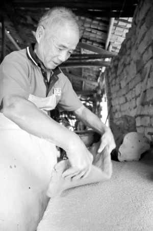 72歲的江瑞仁正在茅草蓋頂、木頭作柱、泥土成墻的簡(jiǎn)陋作坊中把弄陶土。他半彎著腰,熟練地在泥粉里倒上水,拌成泥團(tuán),像和面般把土和勻,搓成條狀,再捏扁。在泥坯底之上一層層繞粘了幾圈后,一件類似柱狀花瓶的陶器呈現(xiàn)在了大家面前。接著再壓實(shí)、抹平、抹光,陶器制作完成。老人說(shuō),這是農(nóng)村房頂上蓋的瓦。經(jīng)窯火燒成,用切割機(jī)從中剖成兩半,才真正完工。