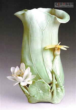 捏雕陶瓷是用手工將柔軟的泥料捏塑成各種形象,然后粘于器皿適當(dāng)部位的一種裝飾技法,帶有極強(qiáng)的手捏痕跡,達(dá)到自然美和人工技巧美高度融合。捏雕的作品以自然事物為題材,一般用比喻和象征手法突出主題,表現(xiàn)人們對(duì)美好事物的追求和寄托人們良好的祝福、愿望等。這件荷葉蜻蜓捏雕花插為中國工藝美術(shù)大師楊蘇明所創(chuàng)作,高32厘米。作品取材于蓮花塘小景,從卷體荷葉中獲得創(chuàng)作靈感,從現(xiàn)代陶藝泥板成型中得到啟發(fā),別出心裁地卷起一片直立的荷葉。荷苞上立著一只蜻蜓,翅膀薄如蟬翼,精巧細(xì)膩,動(dòng)靜結(jié)合,非常生動(dòng)。鮮綠滴翠的荷葉襯托了潔白的荷花,花瓣每片都制作得那么精美,巧奪天工。這件作品贊美了荷花“清凈本因心”的高潔品格,帶來了夏日清涼氣息,充滿詩情畫意。作者以嫻熟的技藝,借助于色釉、色泥等陶瓷材質(zhì),捏塑出荷塘清趣,給人一種賞心悅目的美的享受。
