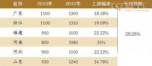 2010、2012我國衛(wèi)浴主要產區(qū)所在省份最低工資第一檔標準對比情況一覽表(單位:元)