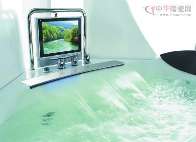 者介紹一款浴缸,該浴缸除具有水流按摩、沖浪等功能外,還裝有9英寸的防水液晶顯示器,這樣在洗浴時(shí)就能看電視、DVD,還能聽(tīng)CD和立體聲調(diào)頻廣播。同時(shí),它還有泡泡浴、恒溫控制、臭氧殺菌、管道清洗等多種先進(jìn)功能。據(jù)銷(xiāo)售人員說(shuō),這款產(chǎn)品以往只做外銷(xiāo),近幾年才開(kāi)始接受?chē)?guó)內(nèi)顧客預(yù)訂,價(jià)格在4萬(wàn)元左右。