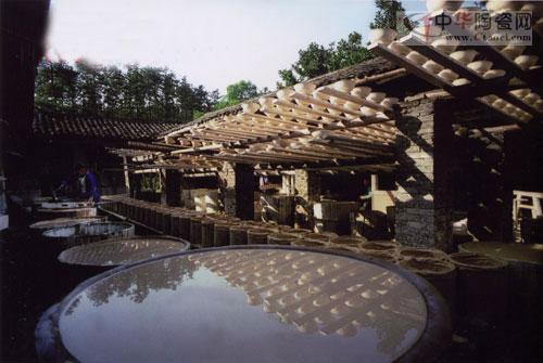 作坊建筑,由三棟或四棟穿逗式木架建筑繞內(nèi)院組合而成。全封閉,平面型猶如北方的三合院或四合院布局。這樣的布局,使作坊建筑內(nèi)部可以獲得良好的采光和通風(fēng)條件。作坊建筑主要由正間和廒間組成,正間是瓷器坯胎制作場所,依照瓷器坯胎制作程序按流水線型式作生產(chǎn)設(shè)施布局。與正間相對的廒間是原料儲存、加工粉碎的場所。正廒間之間相聯(lián)的邊屋,稱“披屋”,是冶煉瓷土并儲泥陳腐的場所,其上設(shè)置活動(dòng)的木架,用于晾曬瓷坯,故俗稱“曬架塘”。