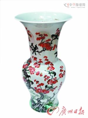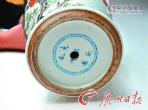 本次送來鑒定的是來自勒流梁姓收藏家的一款美輪美奐的五彩描金花瓶,雖然底部有清晰的文字寫明是“大明成化年制”,但廣東省收藏家協(xié)會副主席、廣州市古玩行業(yè)商會副會長潘繼生卻鑒定出為康熙年的仿制品。盡管是康熙仿品,但因為是五彩描金,而康熙五彩又是中國瓷器歷史上“真正五彩”,所以其蘊含的歷史意義非常豐富。略為可惜的是,這件漂亮的花瓶因為當年是出口貨品,外國人不明白這種花瓶的特殊構(gòu)造,以為是燈具,將瓶底鉆一小孔插入燭臺,讓這件稀世之寶破了相。潘繼生最后的鑒定為“五彩描金梅雀花舩”,其中“舩”并不是“船”的意思,而是瓷器界對這種類型瓷器的特定稱呼。