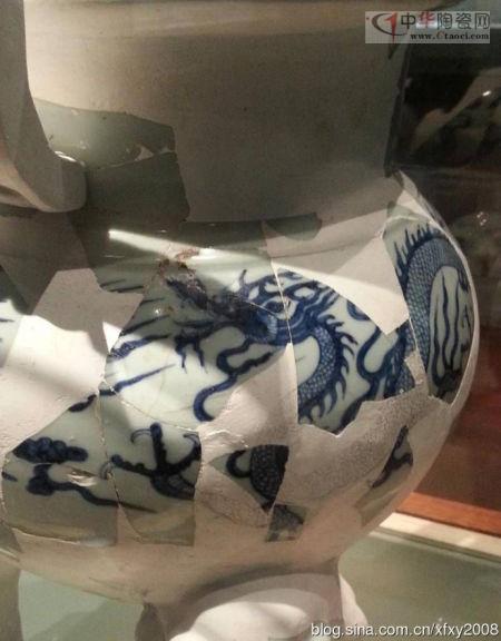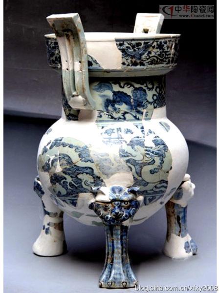 2013年4月16日上午,鎮(zhèn)江市文廣新局召開(kāi)2013年第二季度重點(diǎn)工作新聞發(fā)布會(huì),介紹了京口閘遺址發(fā)現(xiàn)至今,發(fā)現(xiàn)了多個(gè)古代遺跡。其中,一對(duì)元代青花海水龍紋香爐尤為珍貴?梢哉f(shuō)是自景德鎮(zhèn)窯址區(qū)發(fā)現(xiàn)同類(lèi)香爐標(biāo)本之后,其他地區(qū)至今發(fā)現(xiàn)的唯一一對(duì)特殊造型的元青花瓷器。此鼎元代青花海水龍紋香爐造型別致,器形碩大,整體造型夸張而不失大氣。頸部設(shè)有一副對(duì)稱(chēng)長(zhǎng)方形孔的“S”形方耳,耳部外側(cè)下半部分別帶有特殊輔首,主體分段印坯接胎成型,勁部外繪鳳紋穿枝牡丹,外腹中部飾海水龍紋,下部設(shè)獸頭三足,通高65.5、口徑34.5、底徑18厘米。整體給人一種氣勢(shì)磅礴之感,足顯元代王朝的非法之氣。