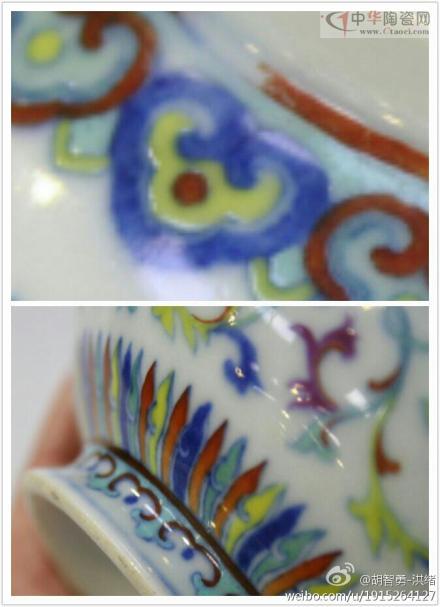 胡志勇撰文說(shuō):“一,罐口沿紅彩的幾處脫落是否脫落的自然?二,紅色為什么是油彩而不是水彩工藝?三,此罐屬于重工斗粉彩工藝,那為什么八寶之一寶瓶,瓶身整體只斗一色綠,而腹部中紋樣不見(jiàn)用其它色繼續(xù)渲染,這是否符合乾隆時(shí)期不厭其煩的工藝特征?