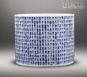 及至嘉慶、道光兩朝,清代瓷筆筒生產(chǎn)步入另一個(gè)階段,此時(shí)仍以粉彩為主要品種,形狀以細(xì)高為主,紋飾以人物等居多,較為側(cè)重觀賞性。此時(shí)的另一特點(diǎn)是雕瓷筆筒開始出現(xiàn),多模仿竹雕器物,以黃釉雕瓷筆筒最為出色。官窯多有紀(jì)年款識(shí),民窯有堂名款或刻工名號(hào)。雕瓷的著名工匠有陳國治、王炳榮、湯源和等人。晚清瓷筆筒仍較盛行,但質(zhì)量下降,最典型的特征是胎釉結(jié)合不緊密,釉面泛灰,青花浮于器表,多有六字青花款和六字紅彩圖章款。