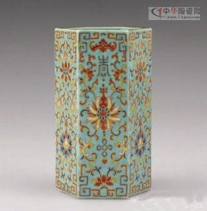 清嘉慶松石綠地粉彩描金福壽六方筆筒在2008年匡時(shí)春拍中,僅拍出45.92萬元。