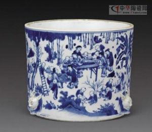 雖然瓷質(zhì)筆筒的制作在明末已呈規(guī)模,但傳世品絕大多數(shù)珍藏在各大博物館中,上拍品相對(duì)較少,成交價(jià)上也遜色于清三代制品。 在中拍國際2011年元明清瓷珍雅玩拍賣會(huì)上,明崇禎青花高士圖筆筒以高出估價(jià)近兩倍的299萬元成交,此筆筒呈直筒形,平底,三條形矮足。筒身青花通景繪高士圖,松下兩人,一人倚石而眠,一人正在搔癢,另兩人站于松后講經(jīng)論道,還有一人坐于溪邊,遠(yuǎn)眺群山。人物繪畫精細(xì),神態(tài)描寫逼真,筆觸纖細(xì),青花發(fā)色明艷,堪稱崇禎時(shí)期青花瓷器的精品力作。當(dāng)時(shí)紋飾題材刻意迎合社會(huì)風(fēng)尚的需求。其中以人物類的題材最具特色,體現(xiàn)出高超的制瓷水平與鮮明的文人意趣。對(duì)此,晚清寂園叟于《雅》卷上有評(píng):“明瓷青花人物,以筆筒花觚為甚詼詭”、“明瓷青花筆筒,往往凹雕一圍填以影青。畫筆工給無款識(shí),瓶觚亦然”。在2007年中貿(mào)圣佳夏季藝術(shù)品拍賣會(huì)上,明崇禎青花百子圖筆筒以212.8萬元成交,此件筆筒呈色艷麗而沉著,構(gòu)圖錯(cuò)落有致,人物眾多,場景、山石、樹木以及孩童衣著款式、顏色、游戲的內(nèi)容多變,輪廓線條清晰,筆筒外壁下部塑有三個(gè)獸面,形式新穎,極為少見,且保存完整,實(shí)為難得。