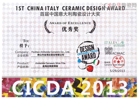 2013年5月29日,在佛山新媒體產(chǎn)業(yè)園首屆“中國意大利陶瓷設計大賽”頒獎禮現(xiàn)場,金海達薄板憑借“北歐楓情”系列產(chǎn)品作為薄板界唯一代表榮獲設計大獎。此次獎項的評比,完全嚴格參照意大利的相關(guān)標準,對參選公司的技術(shù)水平、設計實力進行客觀公正嚴謹?shù)乜荚u,旨在選出設計概念與產(chǎn)品品質(zhì)最杰出的中國瓷磚產(chǎn)品。