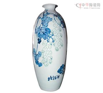 《碩果累累》花瓶器型:撇口,短頸,溜肩,肩以下漸收。運用青花汾水與半刀泥綜合裝飾技法,增強了作品的整體美。主體畫面采用青花汾水技法,表現(xiàn)出枝葉的濃淡,正反與層次。在果實部分則用半刀泥技法,刻出果形,施以數(shù)層青釉,形成凹凸的立體感,使清香四溢像一串串綠寶石一樣的葡萄形象逼真、惟妙惟肖。整件作品,青白空間處理相宜,疏密之間安排有致,汾水層次豐富,明暗濃度變化自然。展現(xiàn)出一副春華秋實、果滿枝頭的絢麗景色!