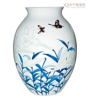 《百年好合》花瓶器型:撇口、溜肩、圓腹。采用半刀泥的裝飾技法突出百合花純潔、天真的形態(tài)。每莖一花,隱隱幽香。以青花勾繪出的葉莖形象簡練,線條剛勁有力,枝葉飄動,畫面無風,卻有輕風拂面之感。三只蝴蝶用粉彩表現(xiàn)得栩栩如生。整體畫面淡雅清新,構(gòu)圖嚴謹,將百年好合的寓意表現(xiàn)得極為突出。