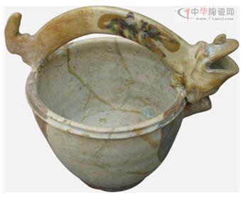 在三彩人物杯中,有體態(tài)肥美,深目高鼻,身著交領(lǐng)短袖衫,以褐彩點染顏面,懷抱一角杯的胡姬形象;有體態(tài)豐滿,深眼睛高鼻梁,滿臉胡須,頭帶尖尖帽,懷抱一角杯的西亞壯漢形象。邛窯生產(chǎn)的此類人物造型的器皿,絕不是偶然的臆造,而是源于對當時社會生活的體驗和觀察,是唐、宋時期我國和西域各國交往頻繁的藝術(shù)寫照,或許還是對外貿(mào)易的需要。