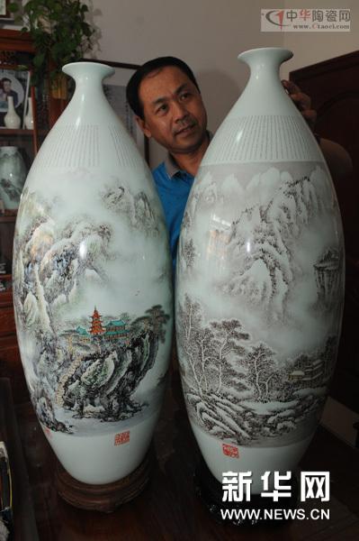 據介紹,這對碟口瓶高83厘米,最大直徑46厘米,是山東省陶瓷藝術大師李秋峰近20年來創(chuàng)作的最大瓷瓶。他將祖國的名山大川匯集在一起,刻畫了春夏秋冬一年四季的山水風光,山巒疊嶂,雋永秀麗,并輯錄了頌詠山水的名言名句一萬多字,雕刻其上,成為不可多得的藝術珍品。
