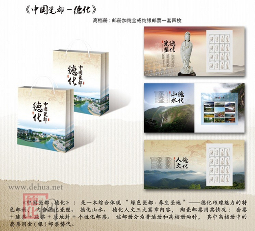 《中國陶瓷-德化窯瓷器》特種郵票于2012年10月20日隆重發(fā)行。限量發(fā)行《中國瓷都.德化》郵票珍藏紀(jì)念冊、《瓷國明珠》郵票珍藏紀(jì)念冊、《盛世瓷韻》卡書折、《古雅神韻》—德化窯瓷器首發(fā)式專題冊、《瓷國明珠.大師風(fēng)采》、《瓷國明珠.品牌企業(yè)》——首發(fā)式紀(jì)念郵冊、《中國陶瓷》郵票珍藏紀(jì)念冊、原地封、原地極限片、極限片、鎮(zhèn)紙、純金、純銀郵票等。