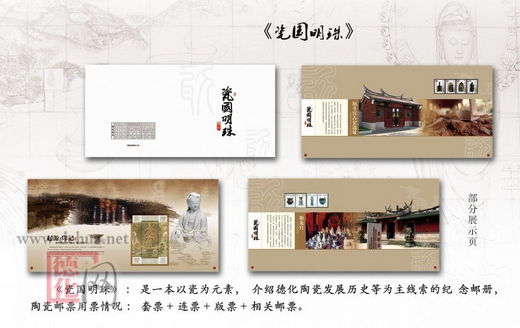 在全縣人民歡慶之際,隆重發(fā)行珍藏紀(jì)念郵冊,郵冊內(nèi)容從各個時期追溯德化瓷都的歷史蹤跡,以方寸郵票圖文并茂展示獨樹一幟的瓷器魅力,外殼以獨特的白瓷片鑲嵌設(shè)計,賦予了這本郵冊深厚的地域文化信息和收藏價值。