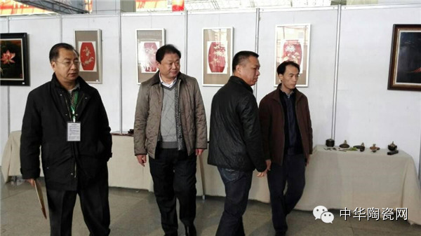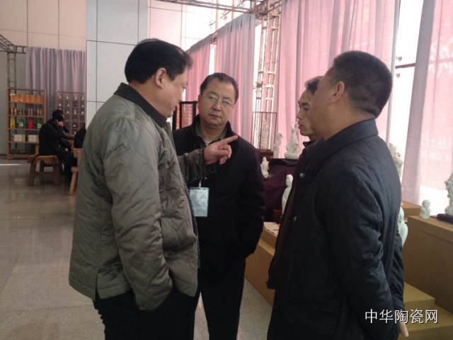邯鄲市旅游局局長(zhǎng)苑慶民(左二)在福建省工美創(chuàng)意設(shè)計(jì)有限公司副總經(jīng)理張光華(右二)陪同下參觀展會(huì)