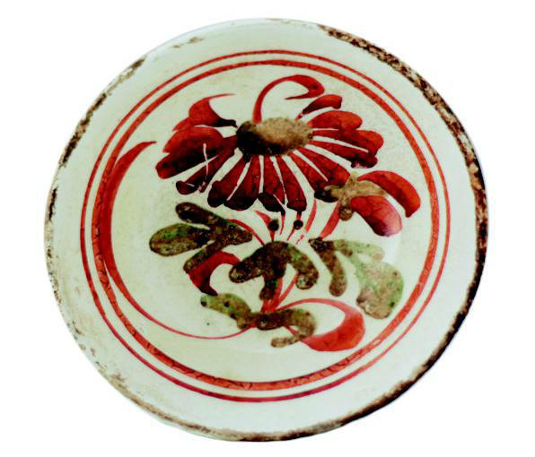 長(zhǎng)治窯生產(chǎn)的紅綠彩瓷,彩色呈色穩(wěn)定,在繪畫(huà)手法和色彩的運(yùn)用上已經(jīng)達(dá)到了較成熟的階段。胎色大部分為土黃色,基本燒結(jié),但斷面無(wú)玻璃光澤。經(jīng)測(cè)試,燒成溫度在1140℃左右。有少量灰胎器物,可以明顯看出是火候過(guò)高所致。白釉、綠彩、黃彩都有細(xì)密紋片,而紅彩沒(méi)有這種現(xiàn)象。紅彩的色調(diào)多呈棗紅色,但由于色料分散得不太均勻,有深淺不均的現(xiàn)象,表面不甚光滑平整,有毛糙的顆粒狀凸出物,這是彩料顆粒細(xì)度不夠所造成的。長(zhǎng)治窯的黃彩和綠彩則呈色純正。