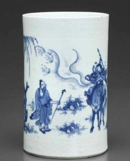 筆筒直腹,口和足的外沿暗刻紋飾,器身通景繪青花人物故事圖。一人騎馬馳至,與持拐老者交談。青花濃淡有致,色澤明快,繪畫細膩,人物刻畫生動、布局合理,胎質細膩。應為一件不可多得之文房佳品。在翰墨飄香的中國傳統(tǒng)文化中,除了筆、墨、紙、硯文房“四寶”之外,還包括了很多的輔助文具,筆筒就是其中的一種。從明代起,制作精致的筆筒就成為文人雅士和收藏家的寵物。