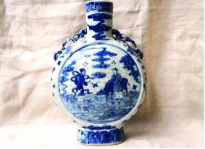 這只康熙年間青花開(kāi)片雙耳扁瓶,是以牛郎織女為神話題材的青花繪圖。瓶高24厘米、口徑5厘米、底徑8.5厘米。瓶面的主要圖案為牛郎織女初次在槐蔭樹(shù)下見(jiàn)面的場(chǎng)景。牛郎頭戴竹笠正在田間放牛,織女騰云駕霧來(lái)到牛郎面前,兩人一見(jiàn)如故。畫(huà)師技藝精湛,描畫(huà)之間人物的面部表情豐富而傳神。扁瓶的口部有回紋環(huán)圈,整齊劃一。扁瓶底部為祥云點(diǎn)綴,四周有祥云喜鵲修飾,整體布局緊湊而富有情趣。瓶底有“康熙年制”四字題款。